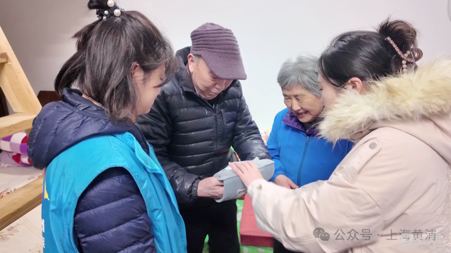 今天中午时分,南京东路街道承兴居民区的社工郑淑华和薛成静,敲开了居民吴林珍的家门。吴林珍今年80岁,老伴85岁,两人相互扶持,是小区里典型的纯老家庭。两人为老人送上了羊毛手套和毛毯等御寒物资,还耐心地叮嘱:“阿婆、爷叔,接下来会有连续三天的寒潮天气,你们两位尽量别出门,有什么需要随时找我们居委会。”