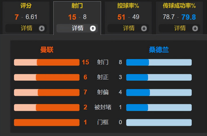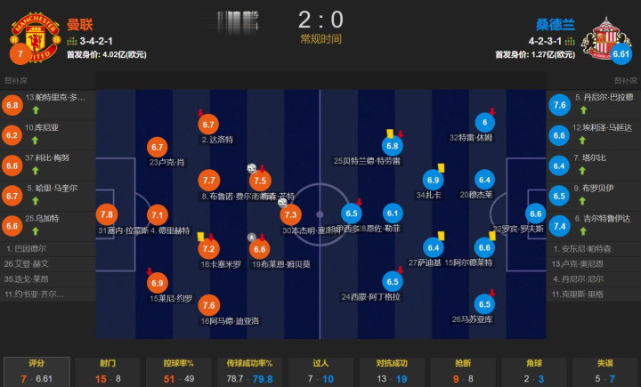 全场比赛,曼联的控球率为51%,一共有15次射门,其中6次射正;桑德兰一共有8次射门闪牛,其中3次射正。